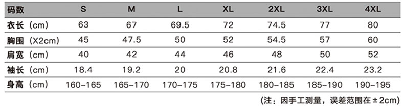 本产品共8个尺码:XS、S、M、L、XL、2XL、3XL、4XL 覆盖99.5%的人群。查看尺码表>