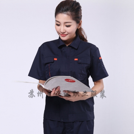 苏州鹰诺服装:深蓝配桔红夏季工衣套装AD069