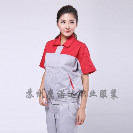 苏州鹰诺服装:大红配浅灰夏季工衣套装AD078